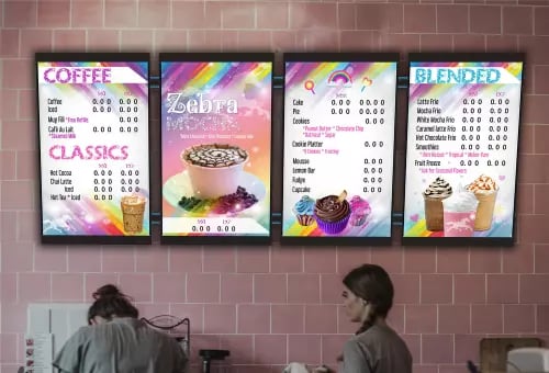 In this illustration, the center panel is a digital display and the other four panels are illuminated LED menu boards.